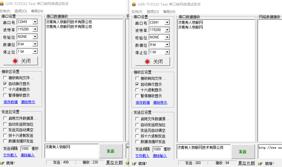 同時打開兩個串口轉(zhuǎn)網(wǎng)絡(luò)助手軟件。一個選擇虛擬串口,一個選擇COM9,即可進行收發(fā)測試