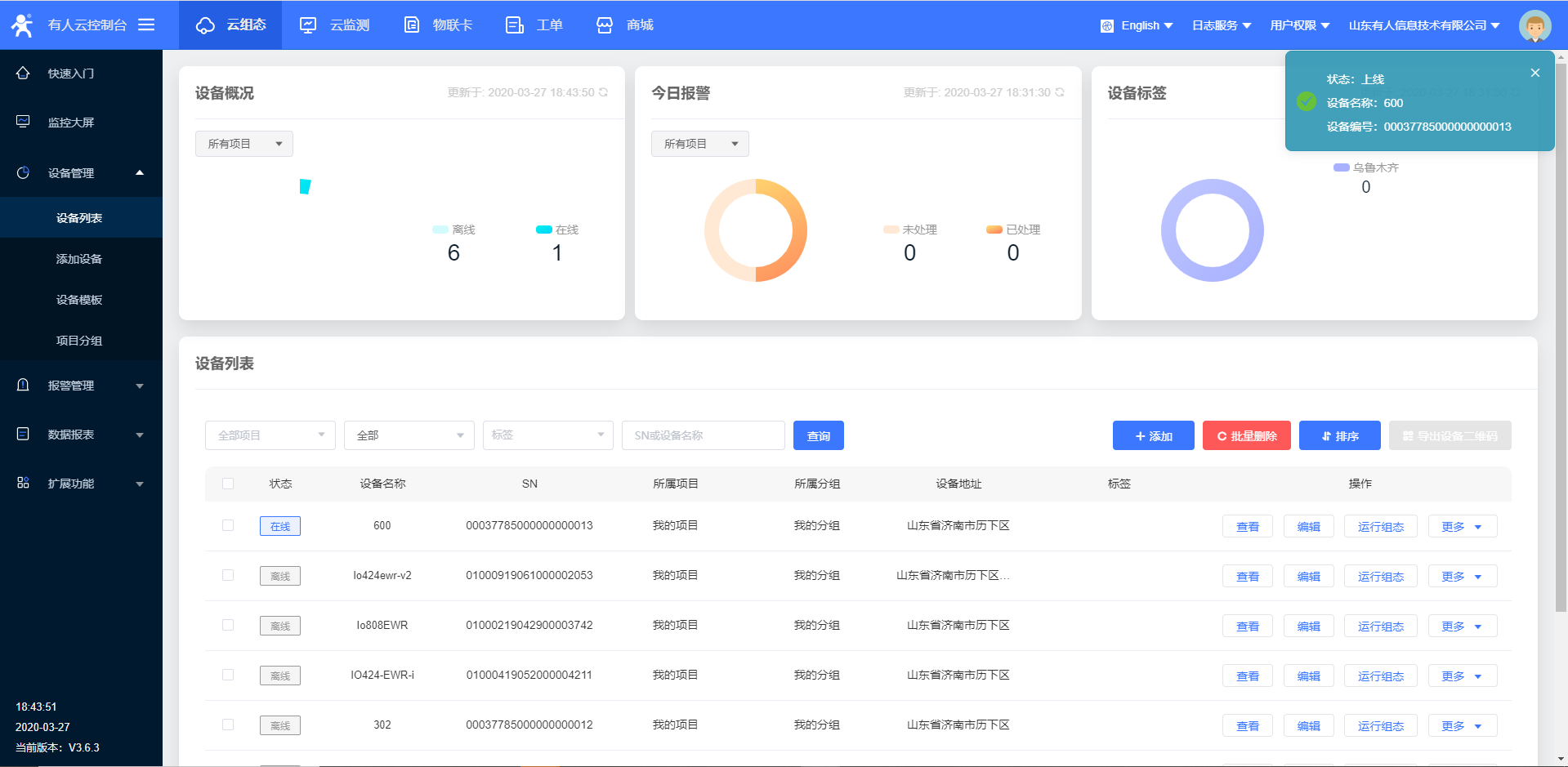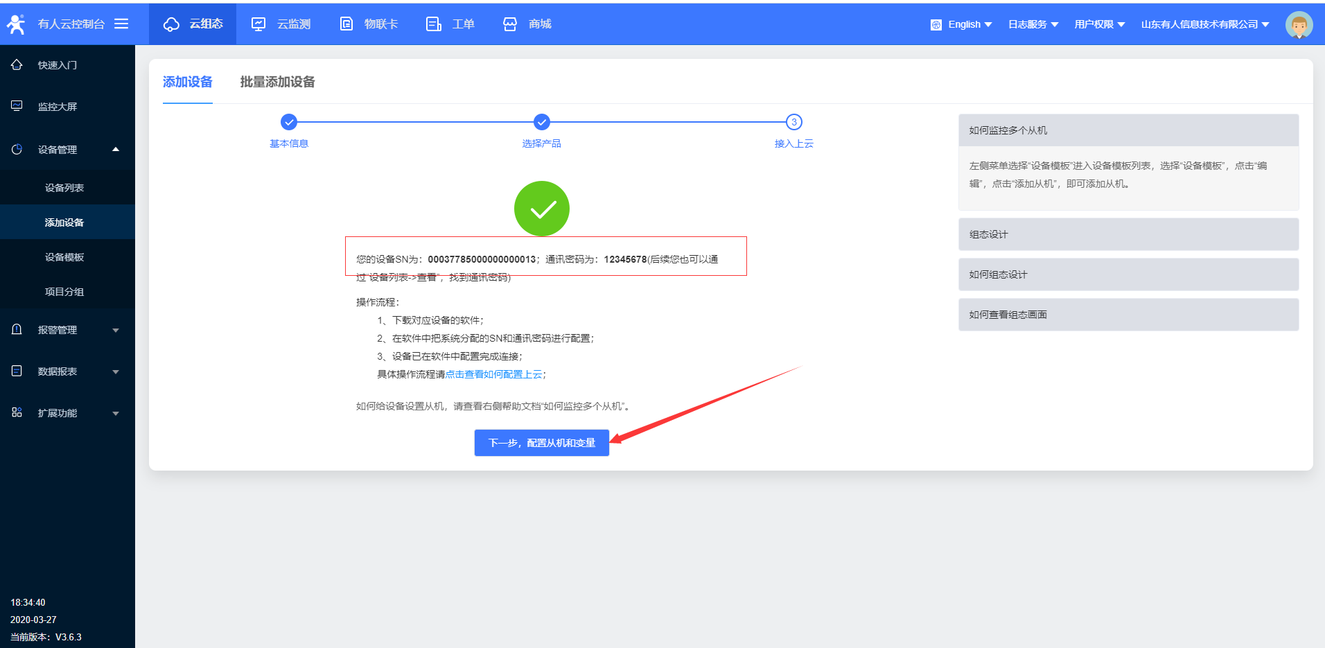 10.設(shè)置完所有的參數(shù)要 重啟設(shè)備,稍等一會(huì),在有人云界面,您會(huì)看到有人云已經(jīng)上線
