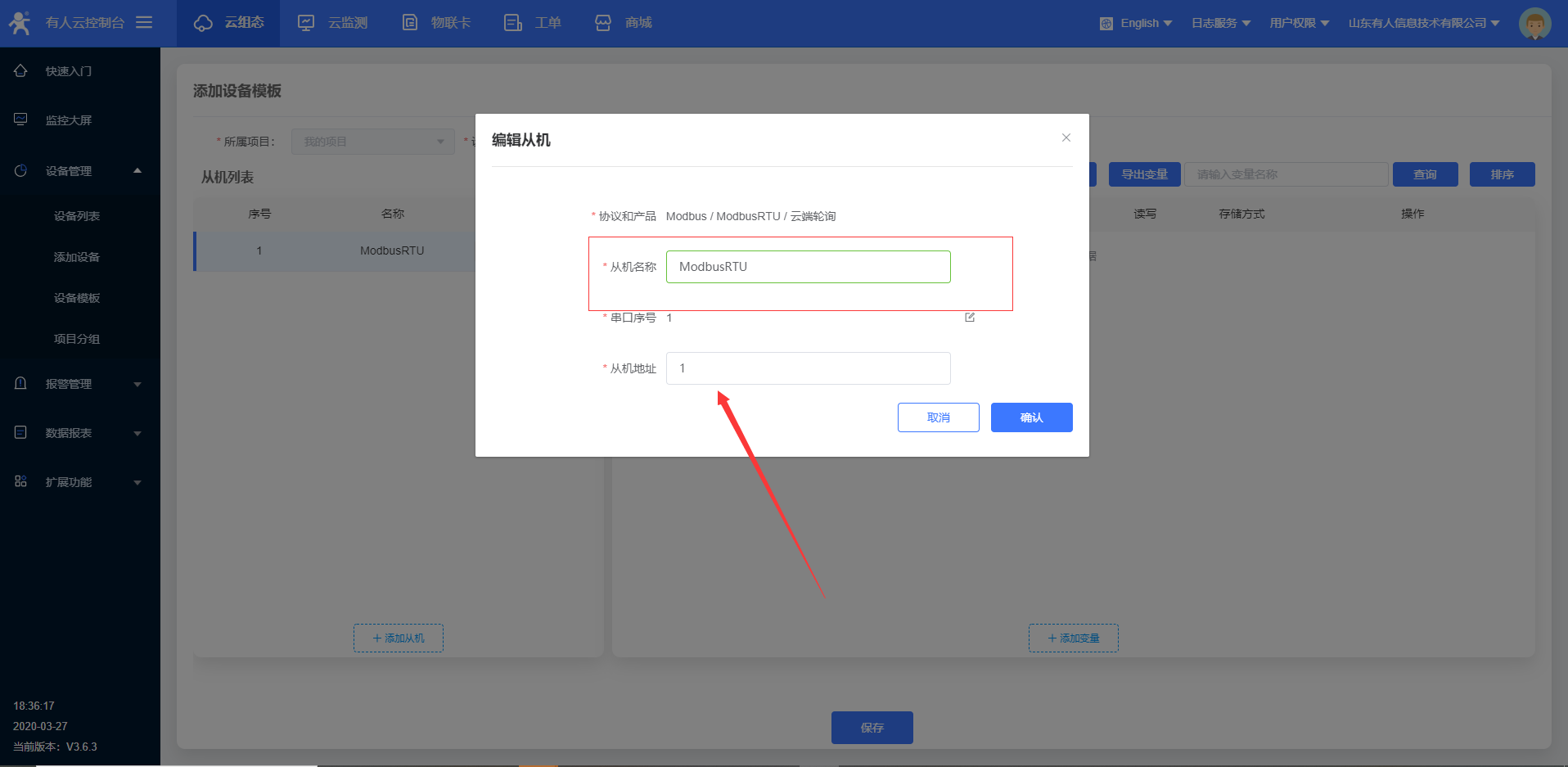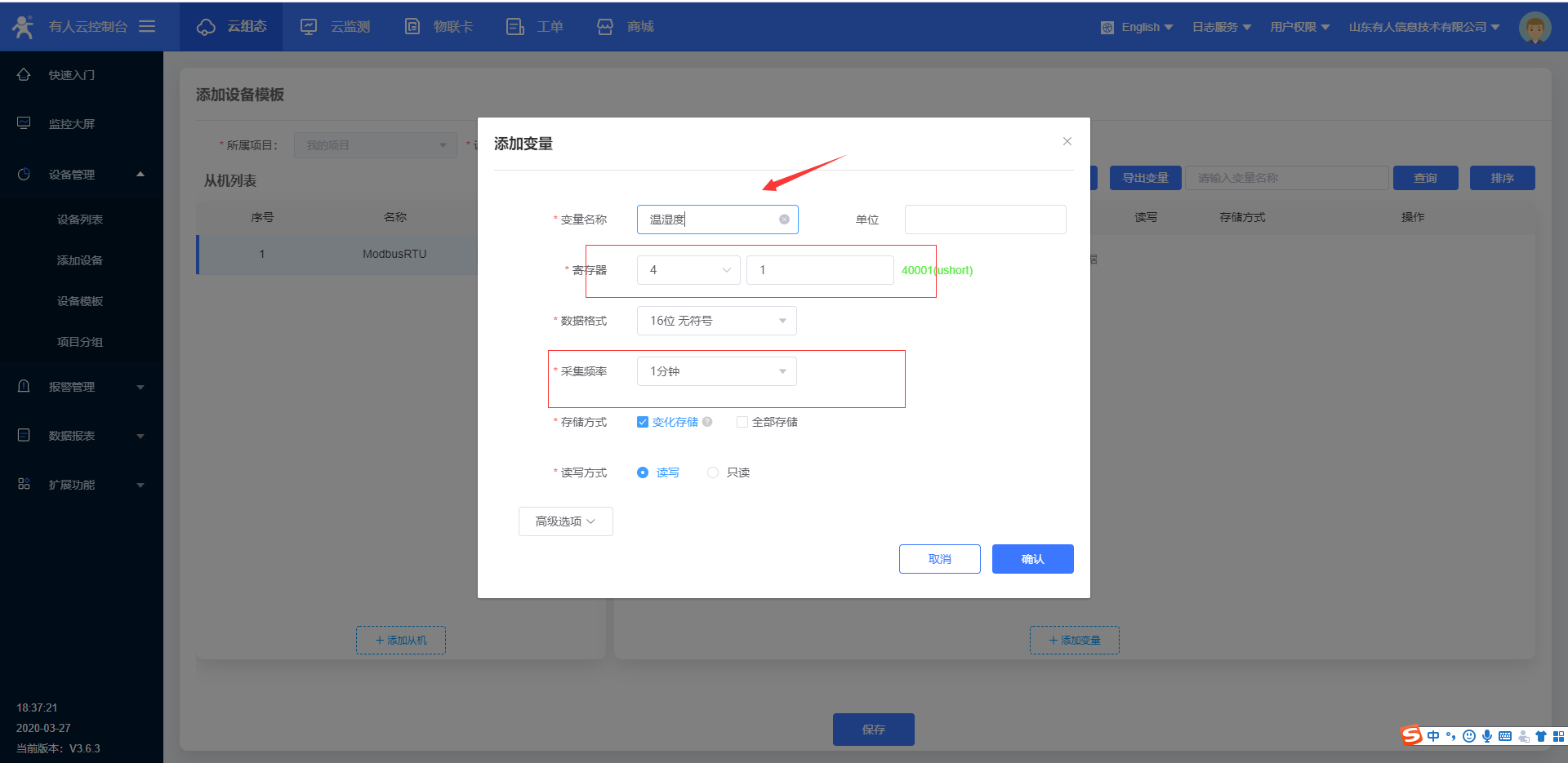 4.進(jìn)入云組態(tài),選擇添加設(shè)備,W600目前只能使用ID方式添加設(shè)備id;設(shè)備id和密碼設(shè)置默認(rèn)就可以,點(diǎn)擊下一步,添加數(shù)據(jù)模,模板更改名稱,選擇modbus rtu云端采集,確認(rèn)添加。