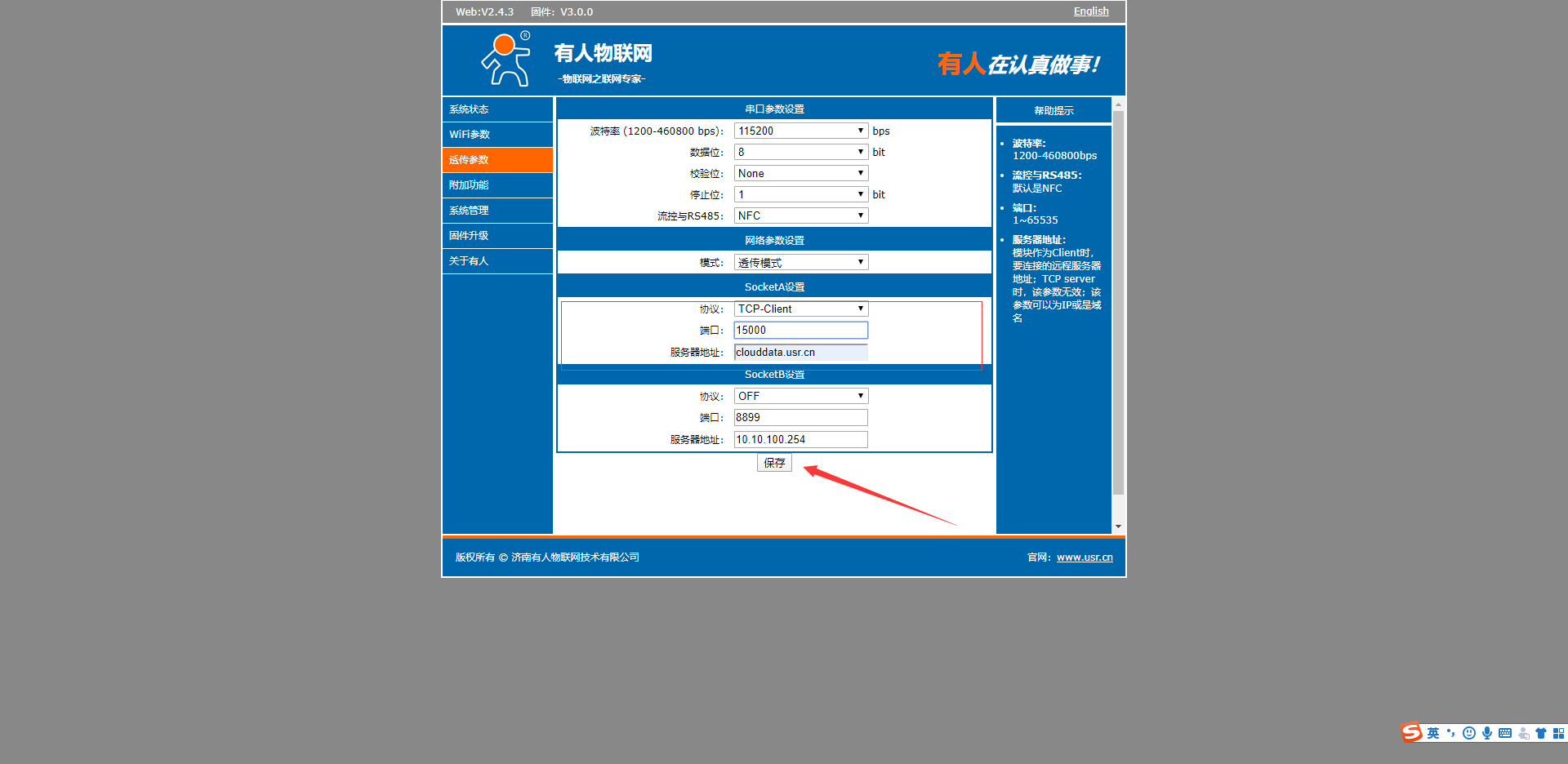 8.在透?jìng)?/span>參數(shù),設(shè)置串口參數(shù)設(shè)置為和您終端設(shè)備的串口參數(shù)一致。做tcp client,遠(yuǎn)程服務(wù)器為clouddata.usr.cn,遠(yuǎn)程端口15000,,點(diǎn)擊保存