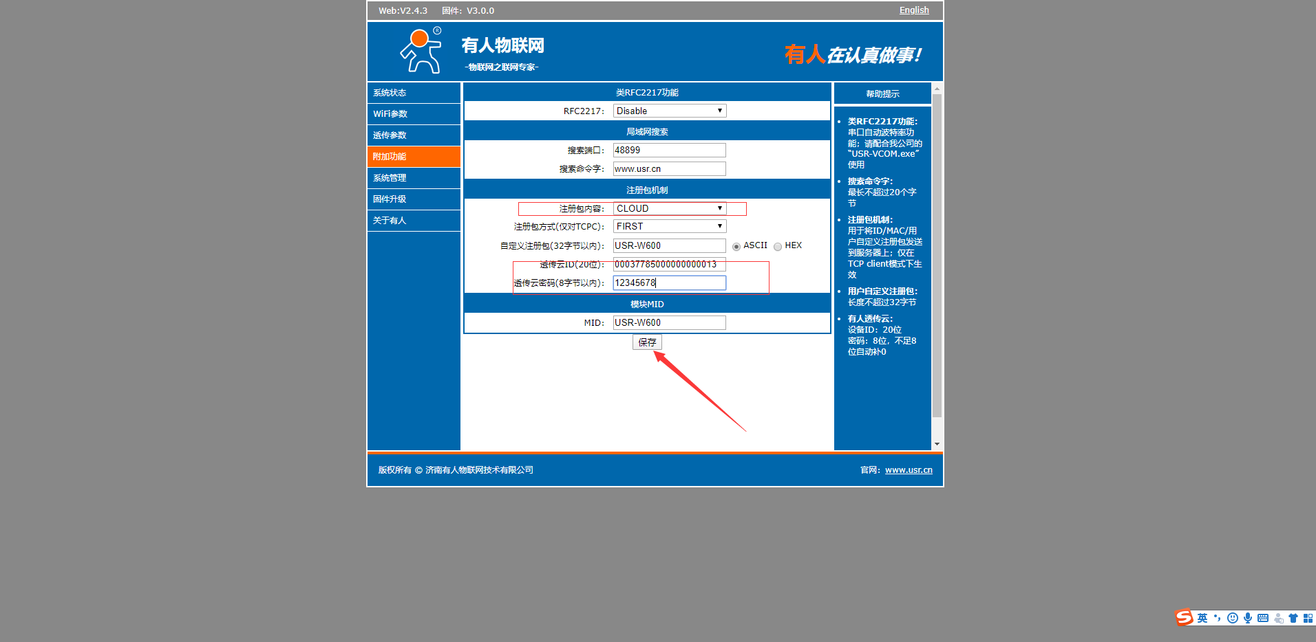 9.在附加功能,注冊(cè)包選擇透?jìng)髟?,填?/span>有人云上新建立的設(shè)備id,和密碼(如下圖所示)
