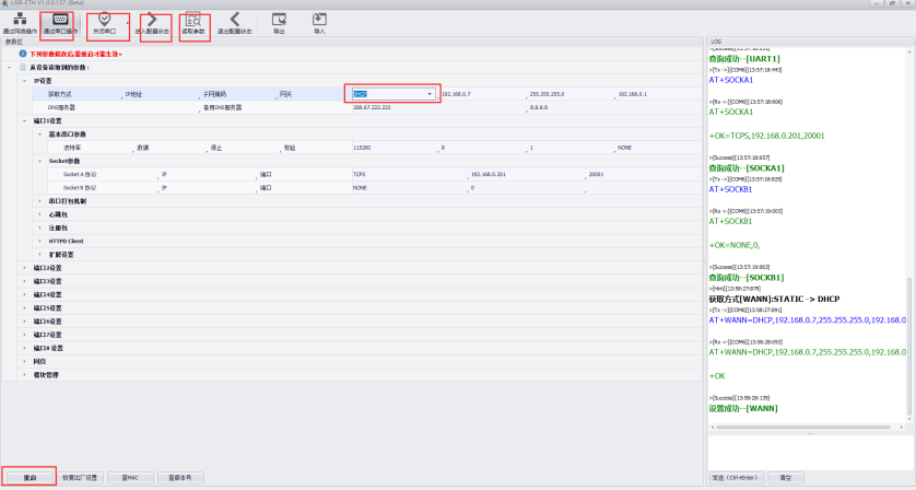 2、進入設(shè)備的設(shè)置軟件,通過串口進入設(shè)置狀態(tài),獲取參數(shù)后,修改設(shè)備為動態(tài)獲取路由器IP,重啟保存。