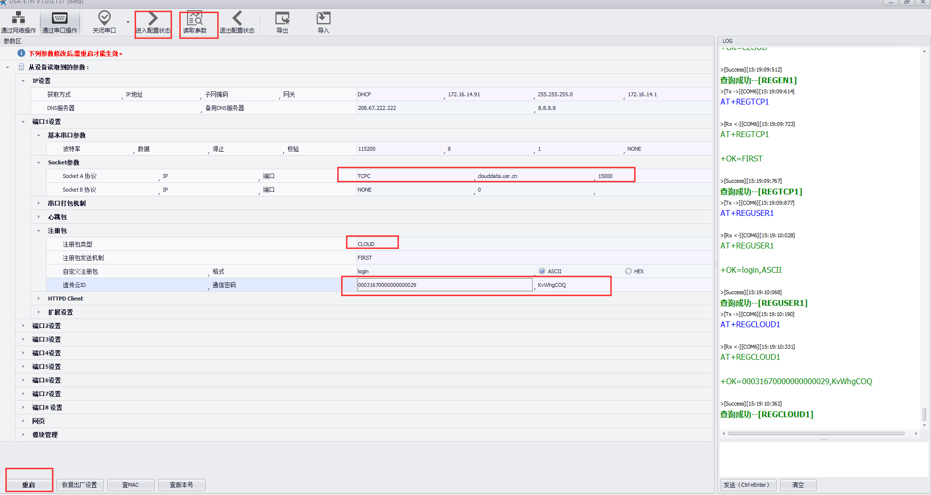 3、重新進入配置狀態(tài)—讀取參數(shù)——設(shè)置透傳云ID為:有人云上添加的SN和密碼(SN與密碼可以通過操作按照圖示下面的案例獲取)。設(shè)置完成后重啟保存。