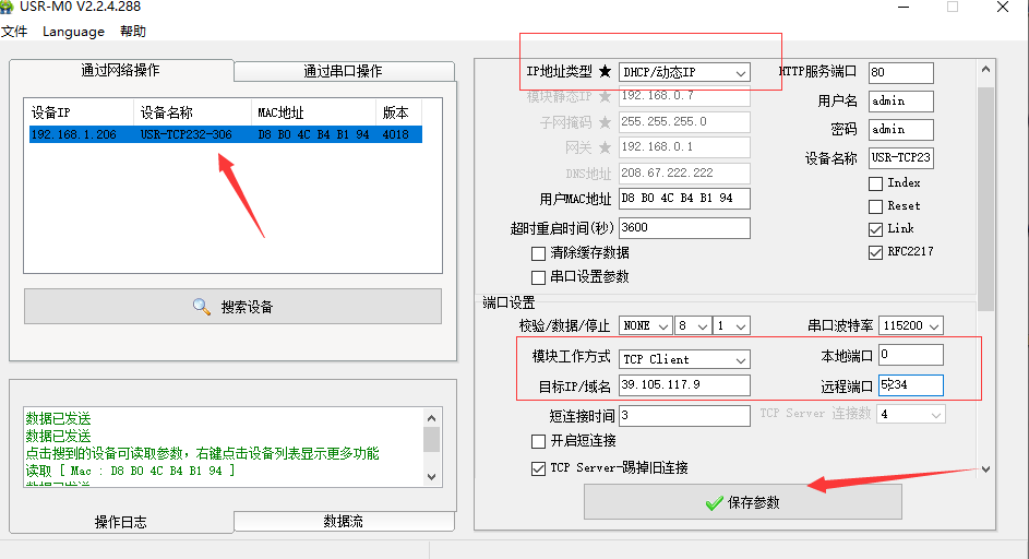 4. IP地址類型更改為DHCP/動態(tài)IP,工作方式選擇TCP Client,目標IP:39.105.117.9(客戶想要連接的服務器的IP地址),遠程端口號:5234,設置完成后點擊保存參數(shù)。