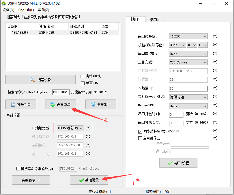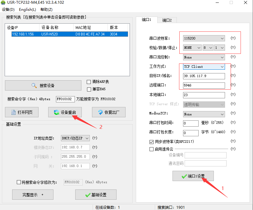 4.修改服務(wù)器地址和端口--->端口1設(shè)置--->設(shè)備重啟。這里填寫的為我自己服務(wù)器的ip,端口為臨時創(chuàng)建的端口,用戶在使用時不可以依照次ip與端口來進行配置,需要連接自己服務(wù)器的ip與端口。
