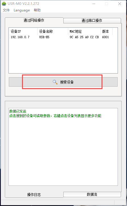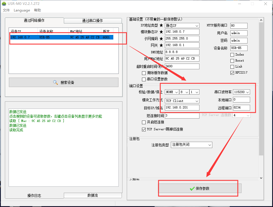 3.打開設置軟件,點擊“搜索設備”當搜索列表中出現(xiàn)K5的設備后,單擊搜索到的設備,查看其配置信息,工作方式選擇TCp Client,目標ip為pC的本地Ip:192.168.0.201,遠程端口為pC的本地端口號:8234