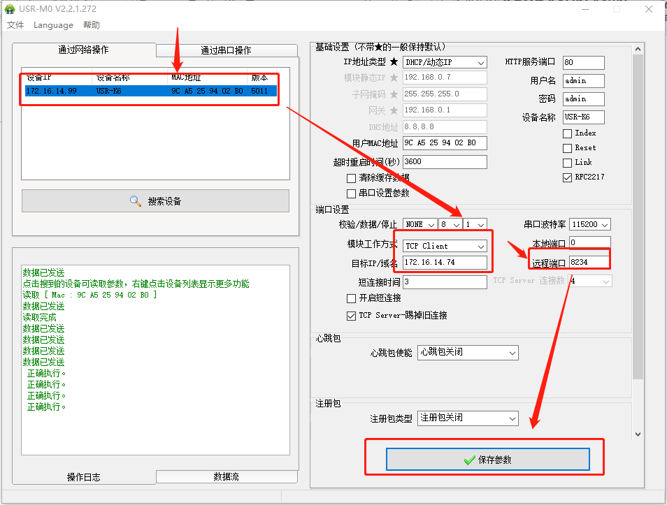 點(diǎn)擊“搜索設(shè)備”,當(dāng)搜索列表中出現(xiàn)K6的設(shè)備后,單擊搜索到的設(shè)備,設(shè)置配置信息并保存(動態(tài)IP),工作方式選擇TCP Client,目標(biāo)ip為虛擬串口IP:172.16.14.74,遠(yuǎn)程端口為虛擬串口的本地端口號:8234