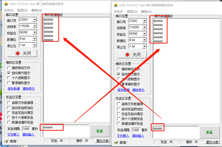 同時打開兩個串口轉(zhuǎn)網(wǎng)絡(luò)助手軟件。一個選擇虛擬串口,一個選擇COM3,即可進(jìn)行收發(fā)測試