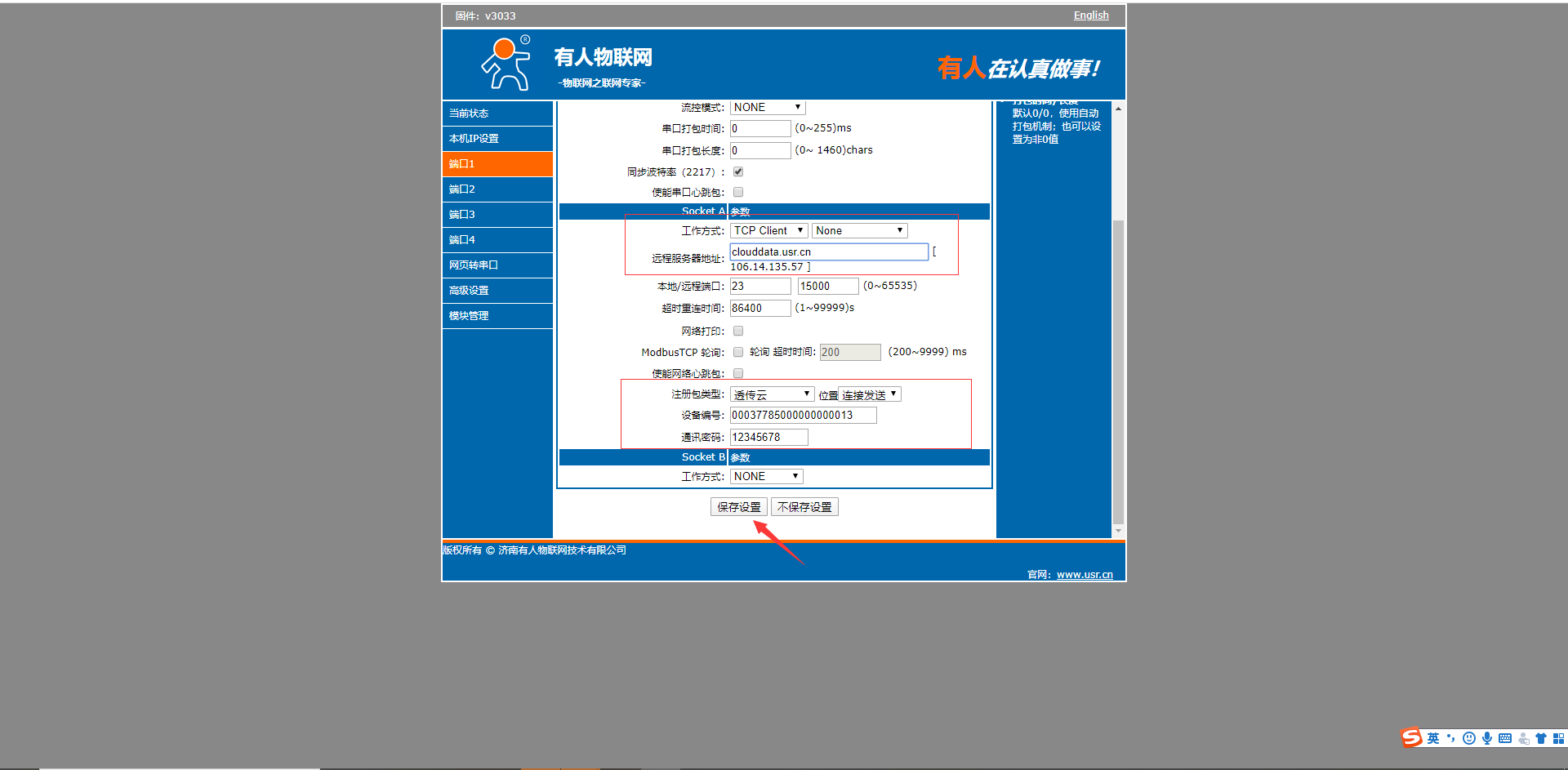 6.工作方式選擇TCp Client,遠(yuǎn)程服務(wù)器地址:clouddata.usr.cn,遠(yuǎn)程端口:15000,本地端口不要設(shè)置為0,默認(rèn)即可
