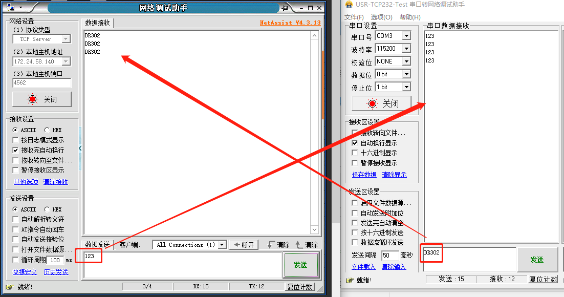 5、打開串口》調(diào)試助手,串口參數(shù)和DR302的串口參數(shù)保持一致,打開串口,即可和服務(wù)器建立通信。