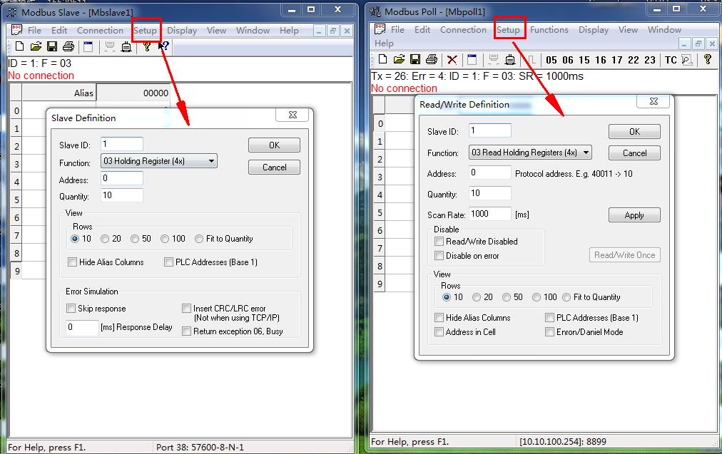 打開(kāi)MODBUS SLAVE軟件,用COM38打開(kāi),串口參數(shù)和B2模塊設(shè)置一致。