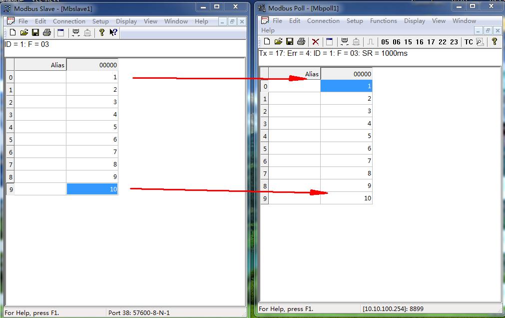 設(shè)置設(shè)備ID 1,寄存器起始地址0(十進(jìn)制),寄存器地址數(shù)量10。