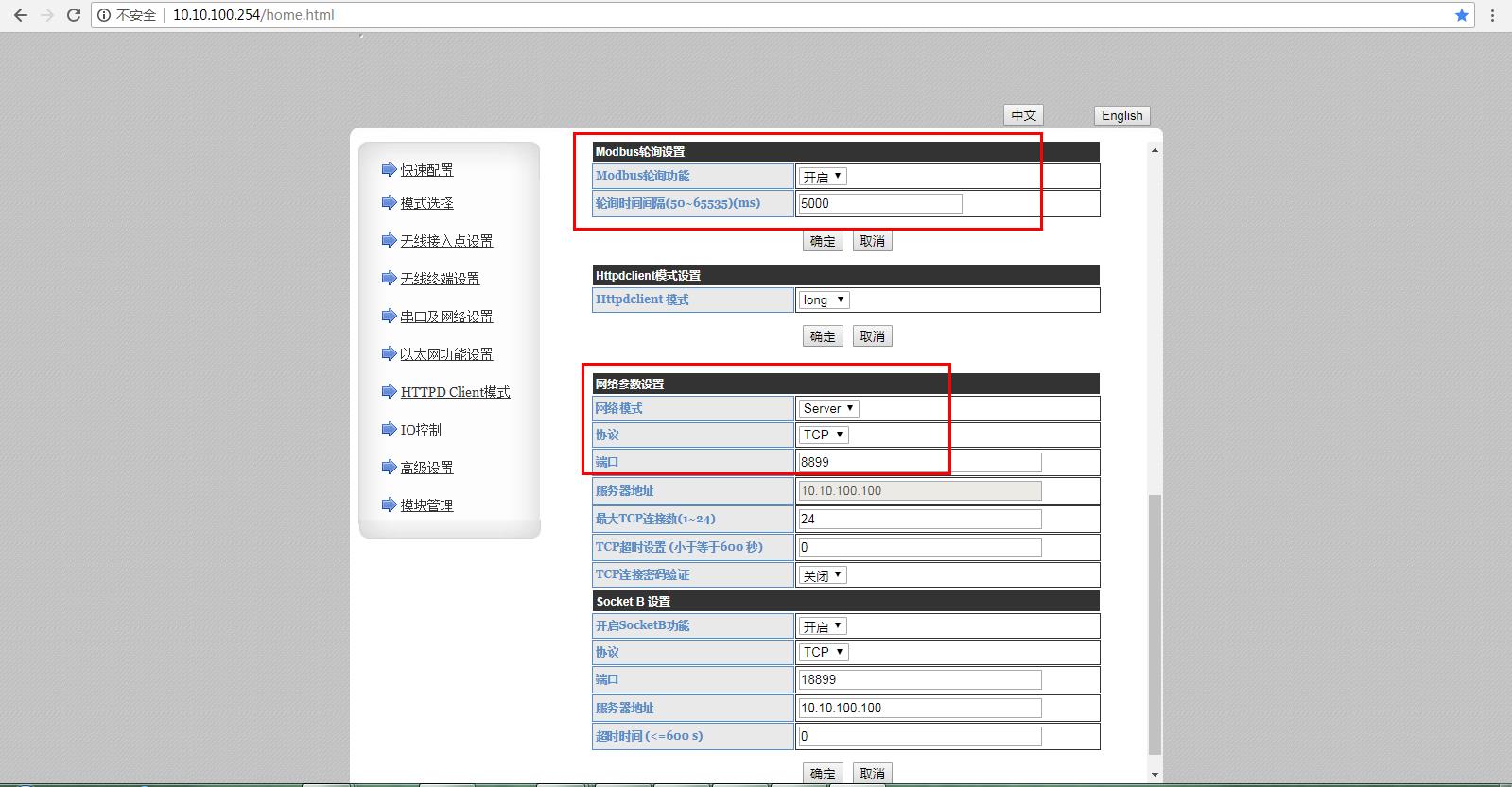 網(wǎng)頁(yè)上設(shè)置Ap模式,開(kāi)啟MODBUS TCp轉(zhuǎn)MODBUS RTU模式。串口及網(wǎng)絡(luò)設(shè)置,設(shè)置串口參數(shù)。MODBUS輪詢?cè)O(shè)置開(kāi)啟,時(shí)間設(shè)置5000ms。網(wǎng)絡(luò)模式設(shè)置TCp server,端口8899。