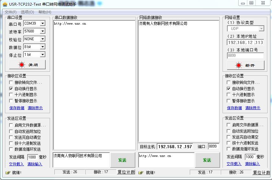 在電腦上用USR-TCp232-TEST軟件測(cè)試,打開COM口,網(wǎng)絡(luò)端設(shè)置參數(shù)。