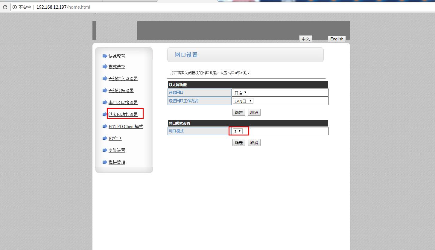 第一步:在以太網(wǎng)功能設置,網(wǎng)口工作模式是LAN口,網(wǎng)口模式設置Z。就是橋接模式。默認是n模式,需要改為z模式。點擊確定。