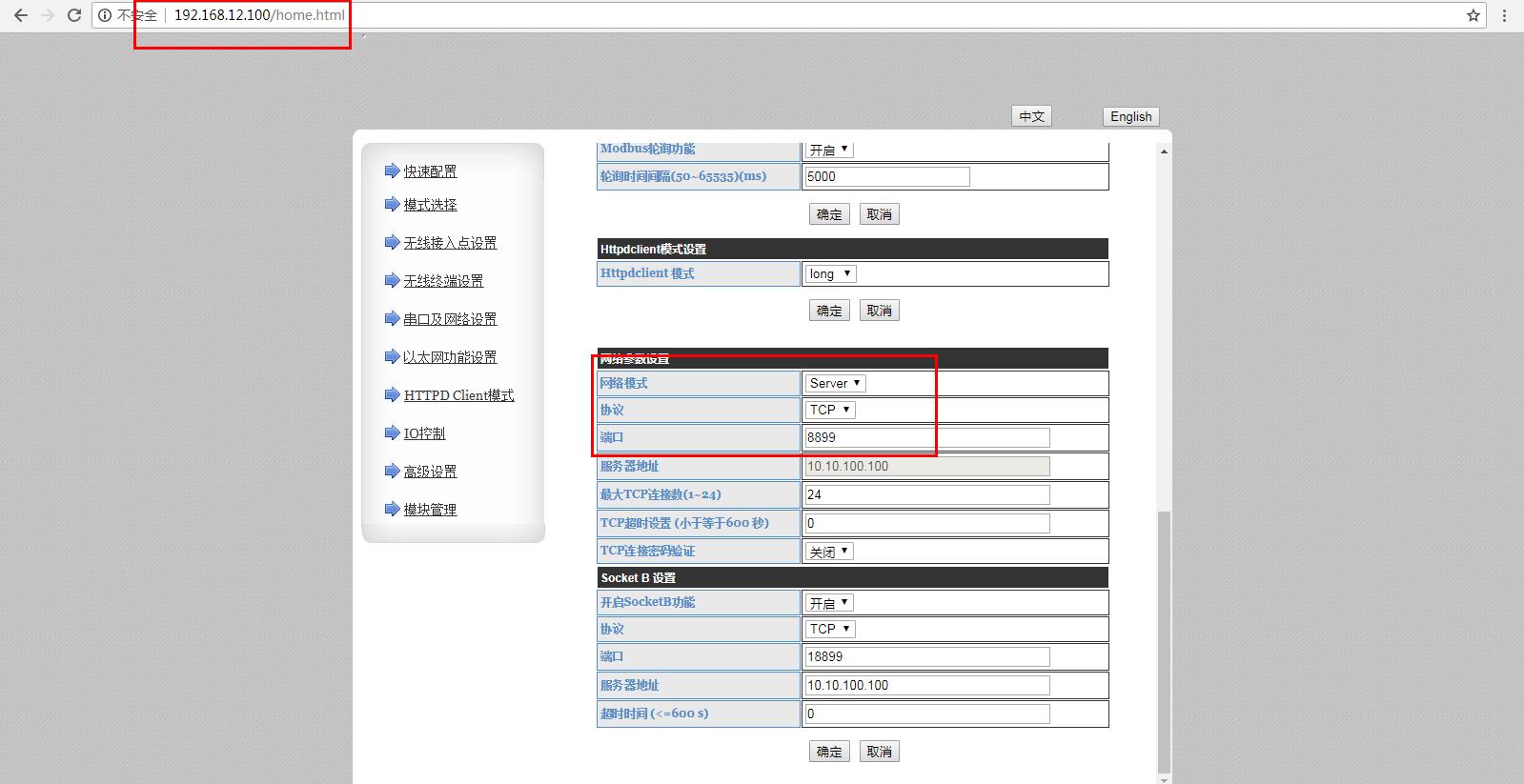 電腦連接路由器的wifi,電腦瀏覽器使用設置的Ip 192.168.12.100,登錄B2模塊的內(nèi)置網(wǎng)頁。