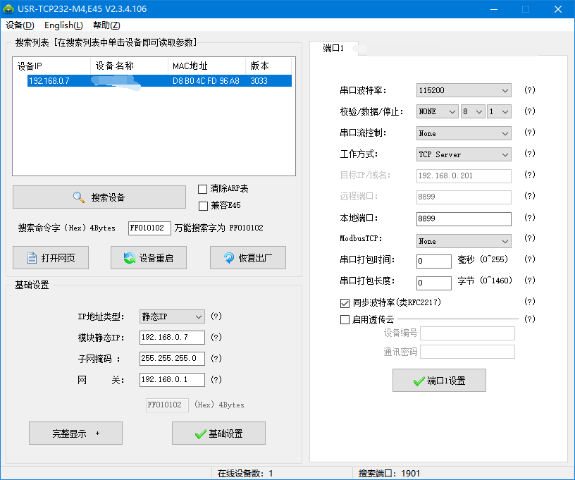 4.設(shè)置參數(shù):將工作方式 ,遠(yuǎn)程服務(wù)器地址和遠(yuǎn)程端口分別設(shè)置為:TCp client、clouddata.usr.cn、15000;