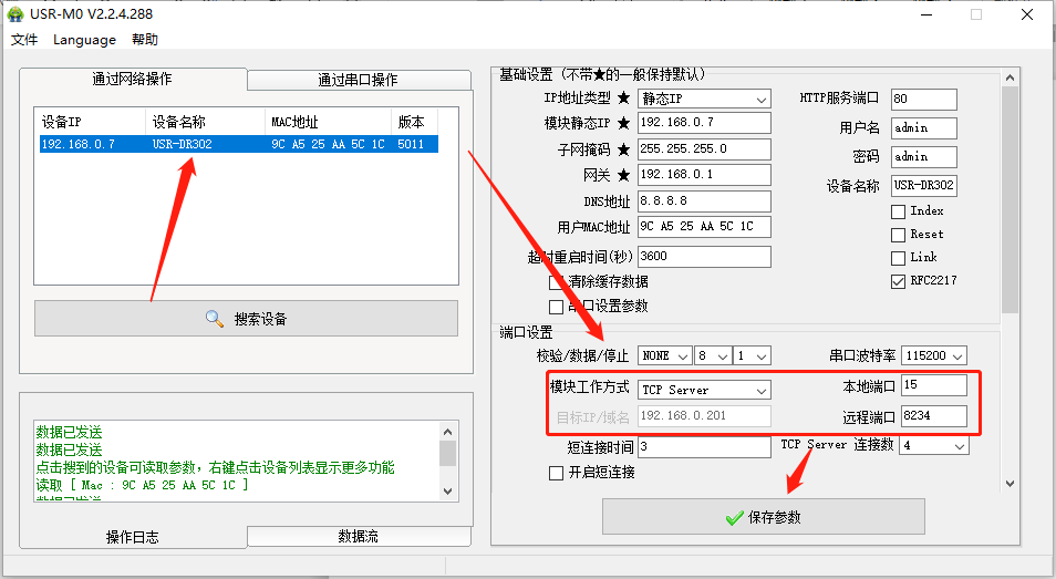 4、打開設(shè)置軟件,點(diǎn)擊“搜索設(shè)備”當(dāng)搜索列表中出現(xiàn)302的設(shè)備后,點(diǎn)擊搜索到的設(shè)備,模塊工作方式設(shè)為TCP SERVER,本地端口15,點(diǎn)擊保存參數(shù)。