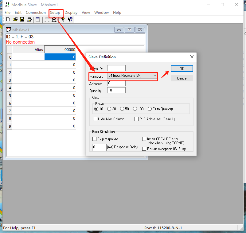 點(diǎn)擊Setup--Slave Definition--function,選擇04功能碼,點(diǎn)擊Ok。