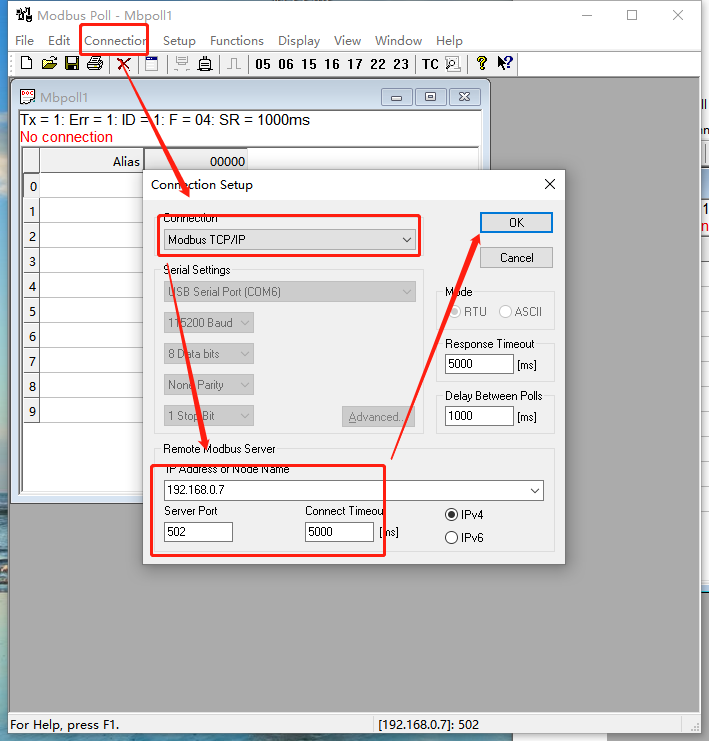 11、點(diǎn)擊connection--connect,connection選擇Modbus TCP/IP,IP地址填USR-M511的Ip地址,Server port填USR-M511的端口號502。