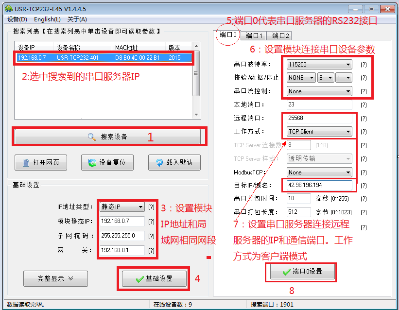 我們采用USR-TCP232-401模塊為例,連接可以聯(lián)網(wǎng)的路由器,電腦連接和模塊相同的路由器。打開設(shè)置軟件USR-TCP232-E45_Setup_V。詳細(xì)設(shè)置按照以下步驟。