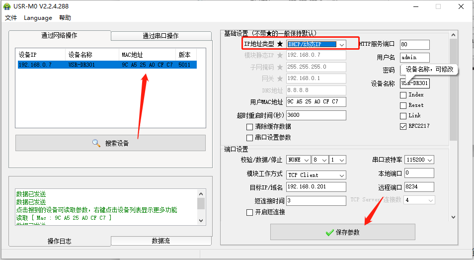 點(diǎn)擊“搜索設(shè)備”當(dāng)搜索列表中出現(xiàn)301的設(shè)備后,單擊搜索到的設(shè)備,右邊基礎(chǔ)設(shè)置,在“IP地址類型”將靜態(tài)IP改為DHCP動(dòng)態(tài)獲取,點(diǎn)擊保存參數(shù)。
