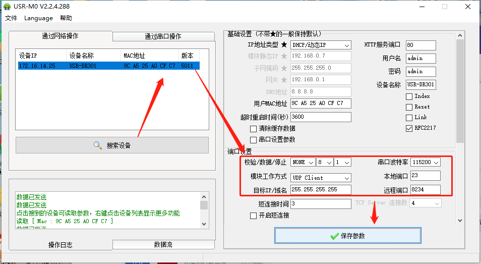 5、301和PC均連接同一個(gè)路由器,點(diǎn)擊“搜索設(shè)備”,可以看到,301的IP為路由器分配的IP:172.16.14.25。