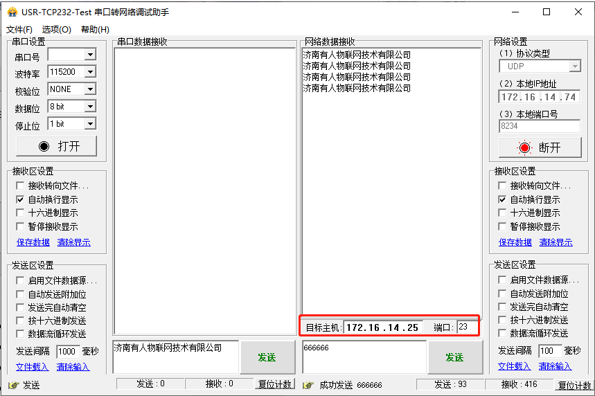 在第二臺(tái)電腦打開串口調(diào)試助手,網(wǎng)絡(luò)端協(xié)議類型選擇UDP,本地IP:172.16.14.58(此時(shí)路由器分配給PC的IP),本地端口號(hào):8234。