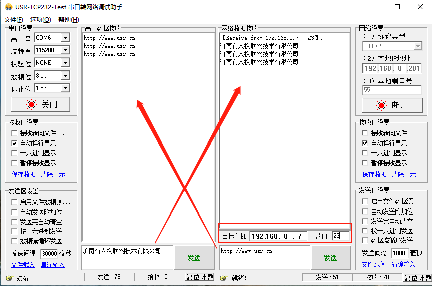 點擊“連接”后,需要將目標主機和端口改為301的Ip和本地端口,然后串口往網絡發(fā)一包數據建立連接后,網絡即可往串口發(fā)數據。