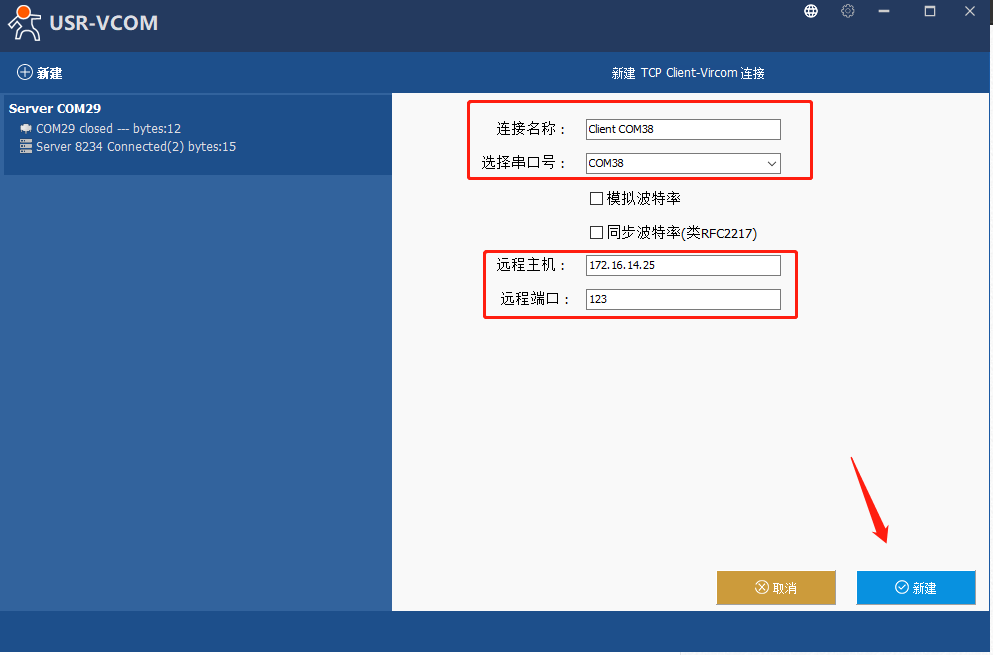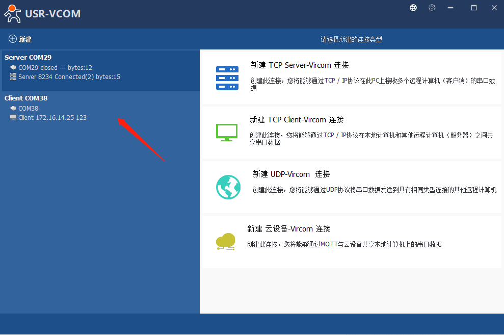 11、打開虛擬串口軟件,點(diǎn)擊“新建TCp Client-Vircom連接”,選擇新的串口號(為了避免串口沖突,盡量往大選),此處以COM38為例,遠(yuǎn)程主機(jī):172.16.14.25(路由器分配給301的Ip),遠(yuǎn)程端口設(shè)為123,點(diǎn)擊新建,可以看到自己剛剛創(chuàng)建的虛擬串口。