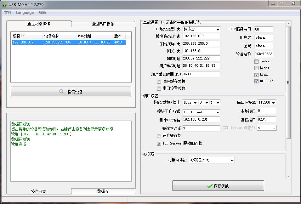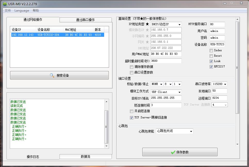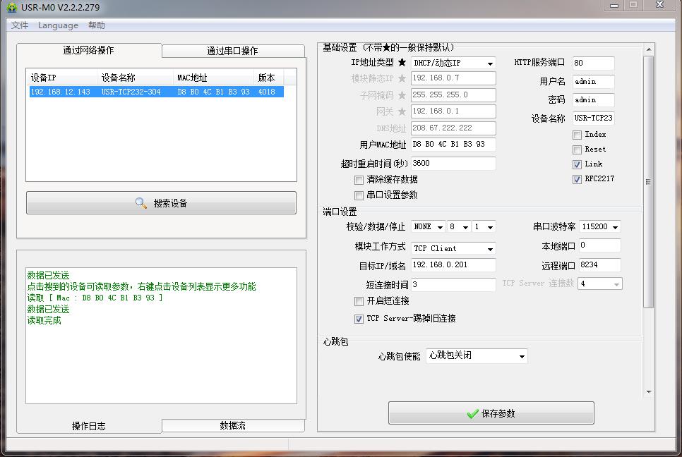 用M0設(shè)置軟件搜索USR-TCP232-304的IP,192.168.0.7,USR-TCP232-304用設(shè)置軟件將IP獲取方式從靜態(tài)改為DHCP,動態(tài)獲取IP。