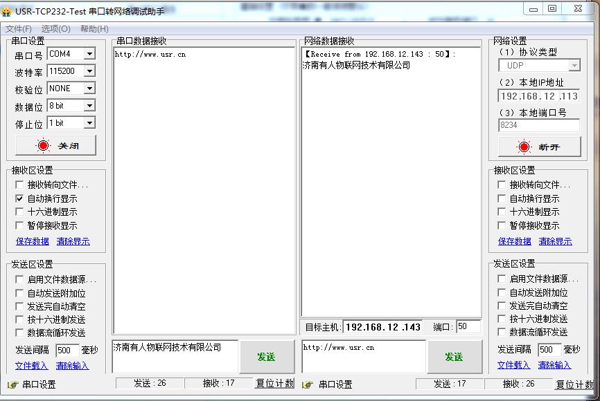 在電腦下載,并安裝打開USR-TCP232-TEST 串口網(wǎng)絡(luò)助手。建立UDP連接,USB-RS485線接第一個電腦,就可以實現(xiàn)304串口和網(wǎng)絡(luò)之間數(shù)據(jù)傳輸。