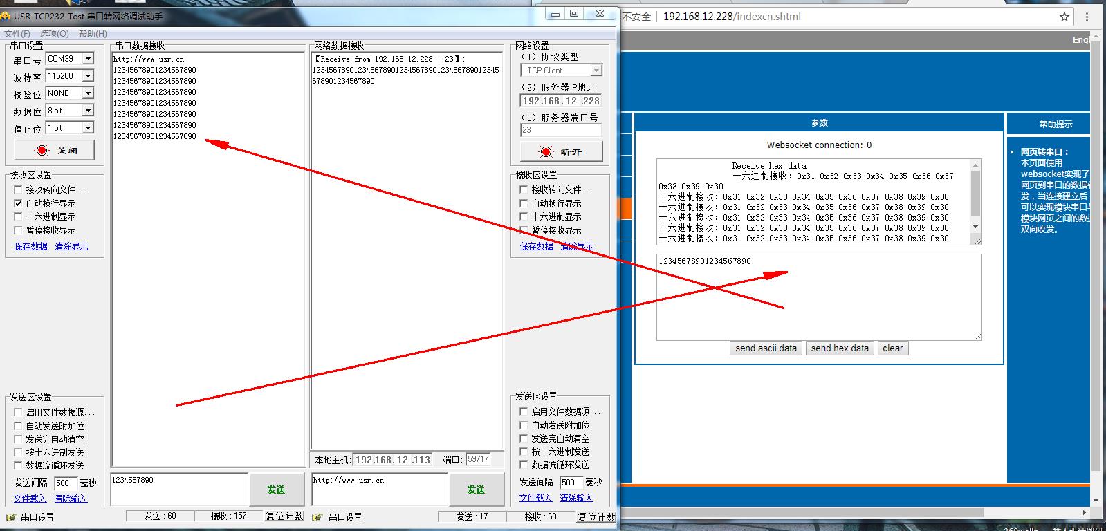 同時(shí)410S網(wǎng)頁(yè)打開(kāi)websocket頁(yè)面,顯示連接成功,然后測(cè)試串口和websocket之間的數(shù)據(jù)傳輸。