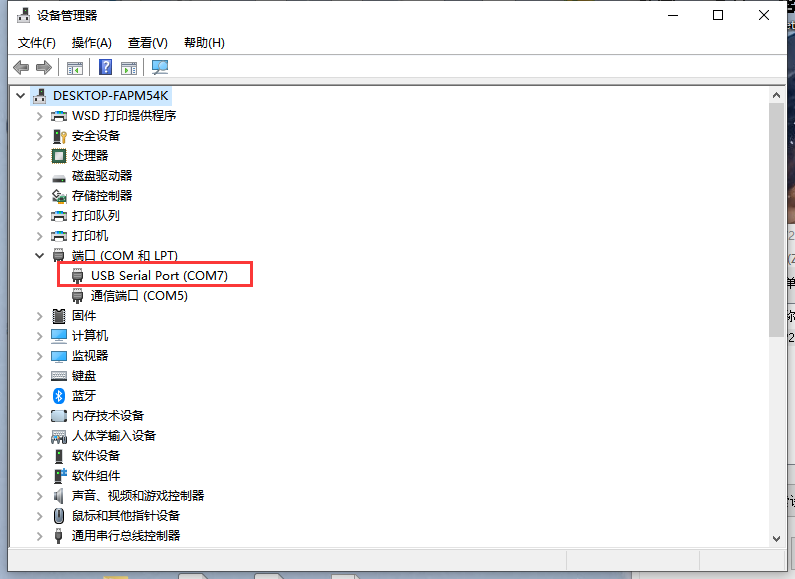 3. 在設備管理器中查看端口信息,確定E2串口使用的串口號,如下圖所示電腦端口號為COM7,如果沒有看的COM口,下載一個驅(qū)動精靈修復一下。