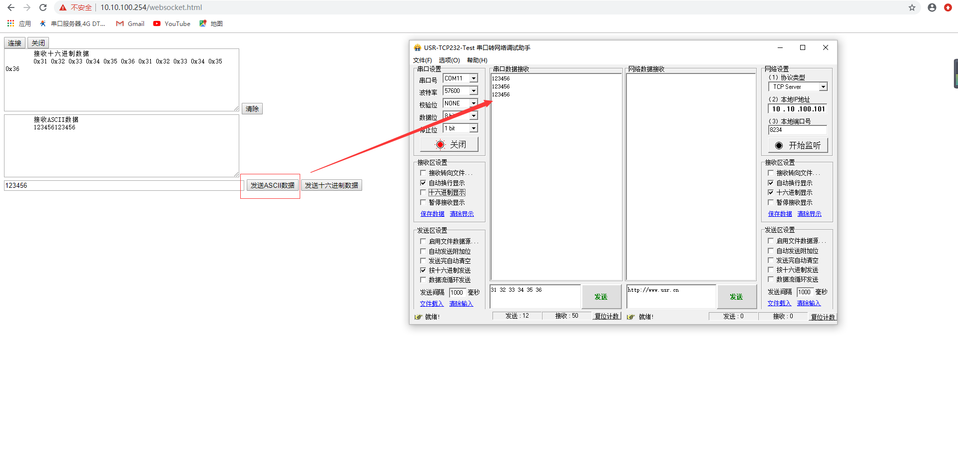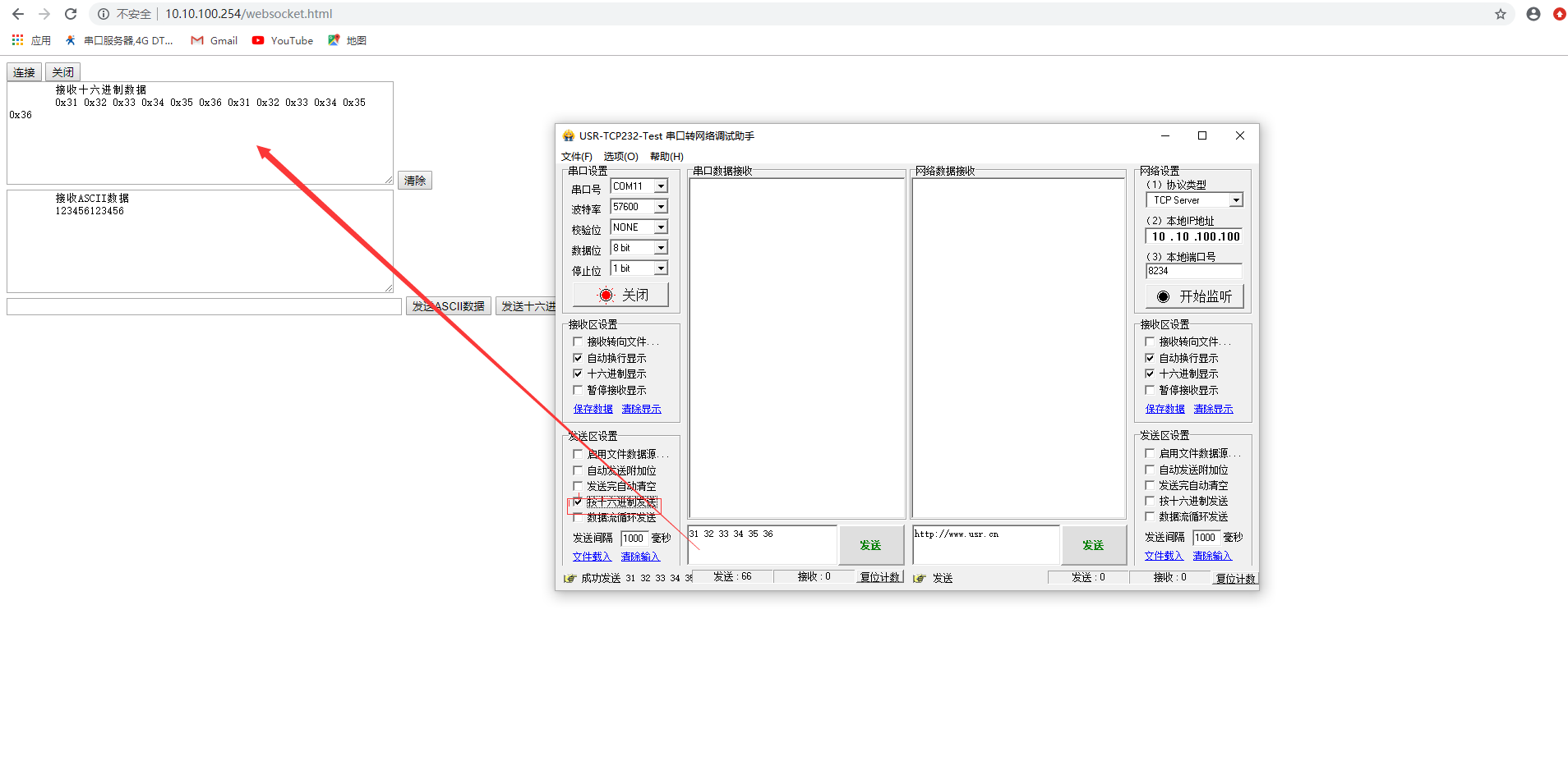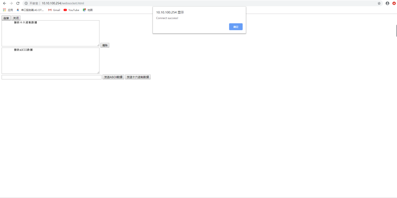 2.瀏覽器輸入10.10.100.254/,進(jìn)入websocket頁面,點擊連接,可以看到連接成功的提示