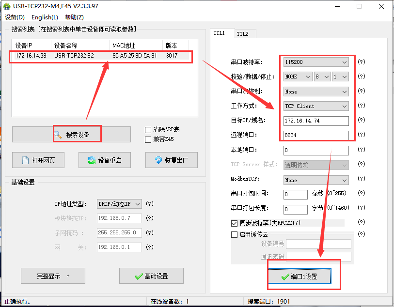 點(diǎn)擊“搜索設(shè)備”,當(dāng)搜索列表中出現(xiàn)E2的設(shè)備后,單擊搜索到的設(shè)備,設(shè)置配置信息并保存(動(dòng)態(tài)Ip)