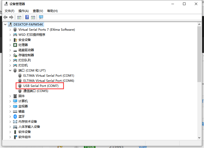 在設(shè)備管理器中查看端口信息,確定K7串口使用的串口號(hào),如下圖所示電腦端口號(hào)為COM7