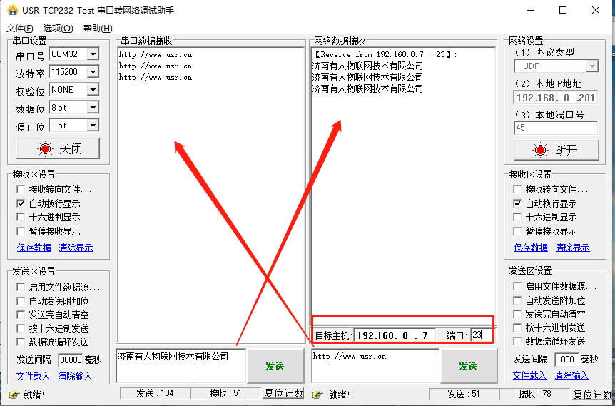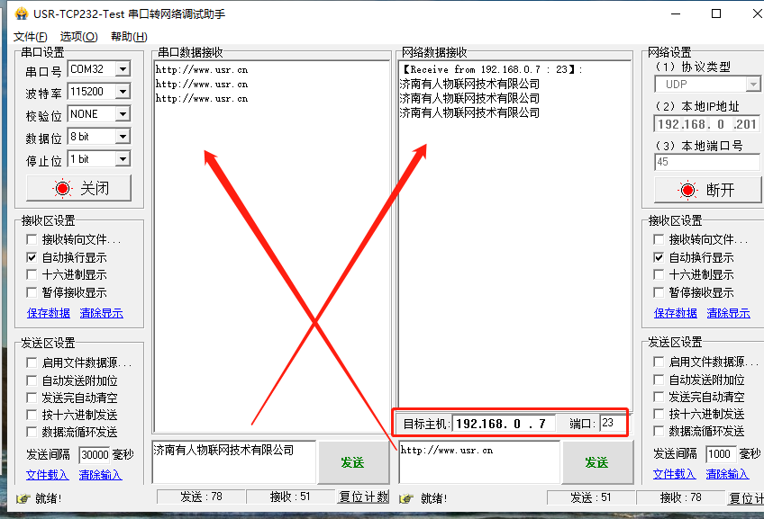 點(diǎn)擊“連接”后,需要將目標(biāo)主機(jī)和端口改為301的Ip和本地端口,然后串口往網(wǎng)絡(luò)發(fā)一包數(shù)據(jù)建立連接后,網(wǎng)絡(luò)即可往串口發(fā)數(shù)據(jù)。