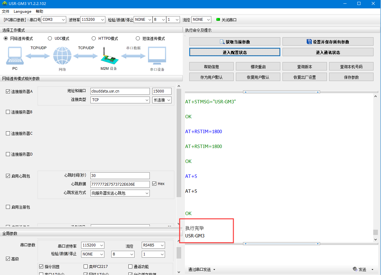 (2)默認(rèn)串口參數(shù)115200 N 8 1,打開串口——進(jìn)入配置狀態(tài)——返回OK說明進(jìn)入配置狀態(tài)成功