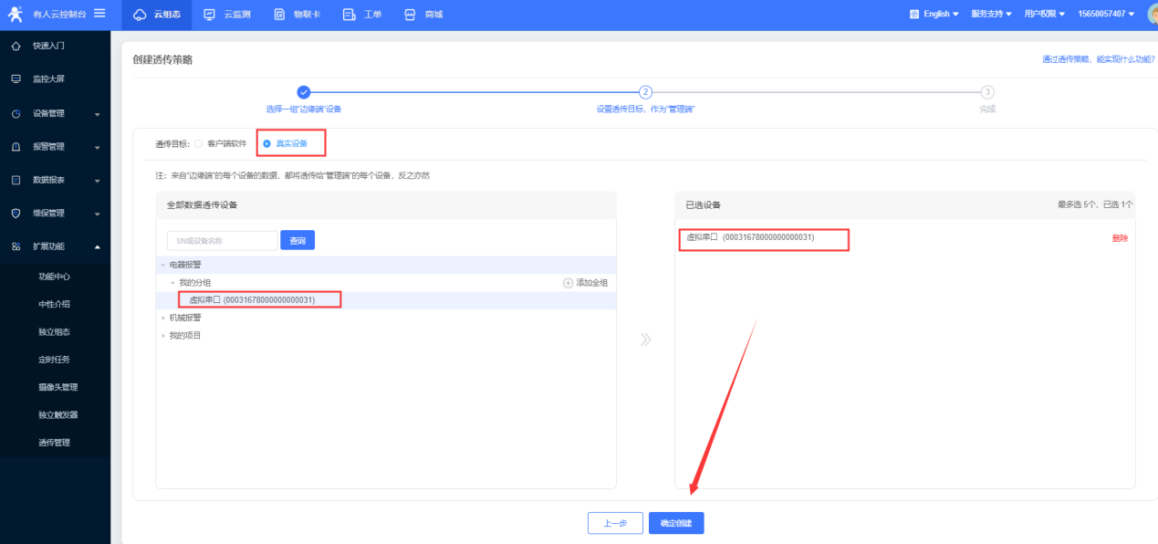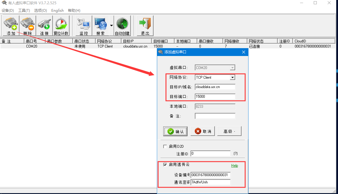 點(diǎn)擊添加——選擇虛擬串口號——網(wǎng)絡(luò)協(xié)議tcp client ——目標(biāo)IP/域名clouddata.usr.cn——端口15000——啟用透傳云——將云端生成的虛擬串口的設(shè)備編號和通訊密碼復(fù)制到參數(shù)區(qū),點(diǎn)擊確認(rèn);可以看到虛擬串口在有人云上線