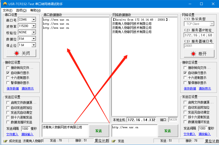 10、在串口和網(wǎng)絡(luò)之間進(jìn)行數(shù)據(jù)收發(fā)測(cè)試,串口到網(wǎng)絡(luò)的數(shù)據(jù)流向是:PC串口->668串口->668以太網(wǎng)口->PC網(wǎng)絡(luò);網(wǎng)絡(luò)到串口的數(shù)據(jù)流向是:PC網(wǎng)絡(luò)->668以太網(wǎng)口->668串口->PC串口。具體演示如下圖所示: