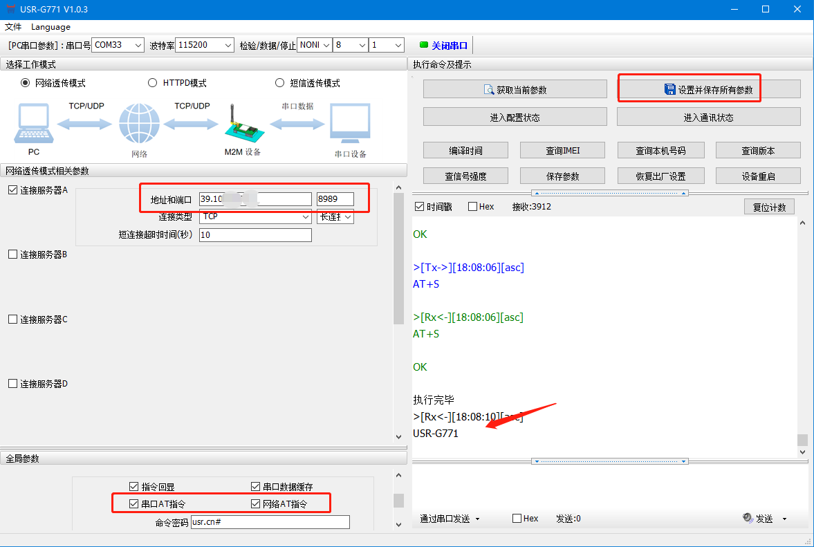 (2)打開串口——進(jìn)入配置狀態(tài)——設(shè)置相關(guān)參數(shù)——設(shè)置并保存所有參數(shù)——串口打印開機(jī)信息說明重啟成功
