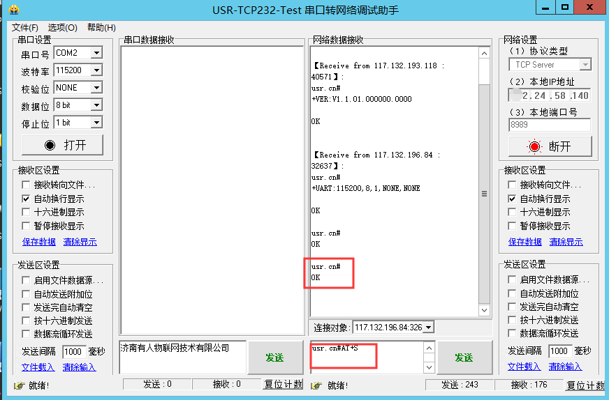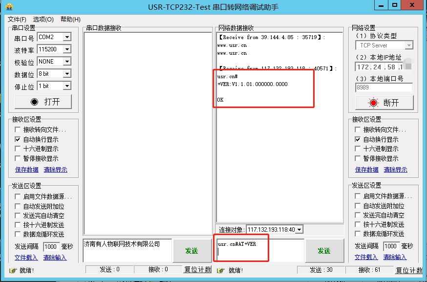 (4)查詢版本:在串口發(fā)送usr.cn#AT+VER+回車換行 可以看到模塊返回固件版本號
