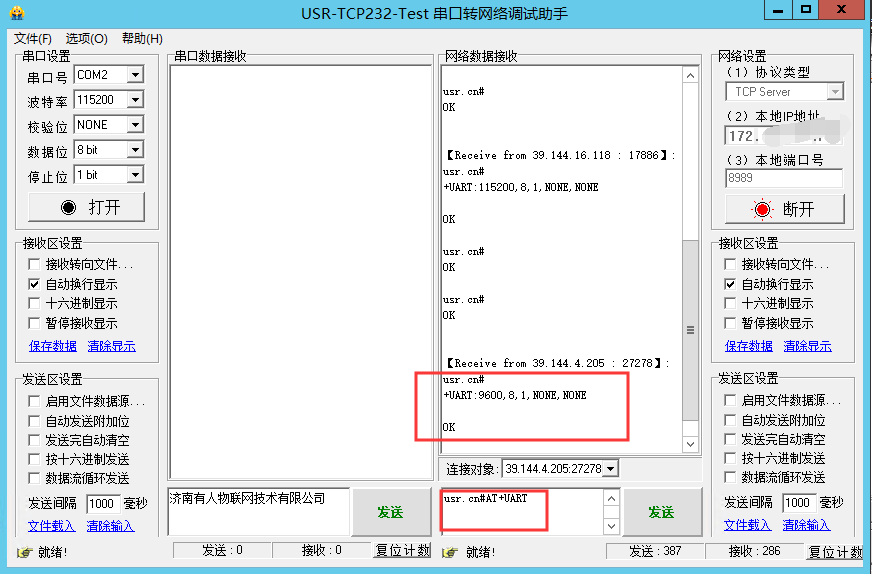 (7)更改以后發(fā)送usr.cn#AT+S+回車換行 重啟以后參數(shù)保存成功;然后重新建立連接以后查詢串口參數(shù),可以看到串口波特率已經(jīng)變?yōu)?600