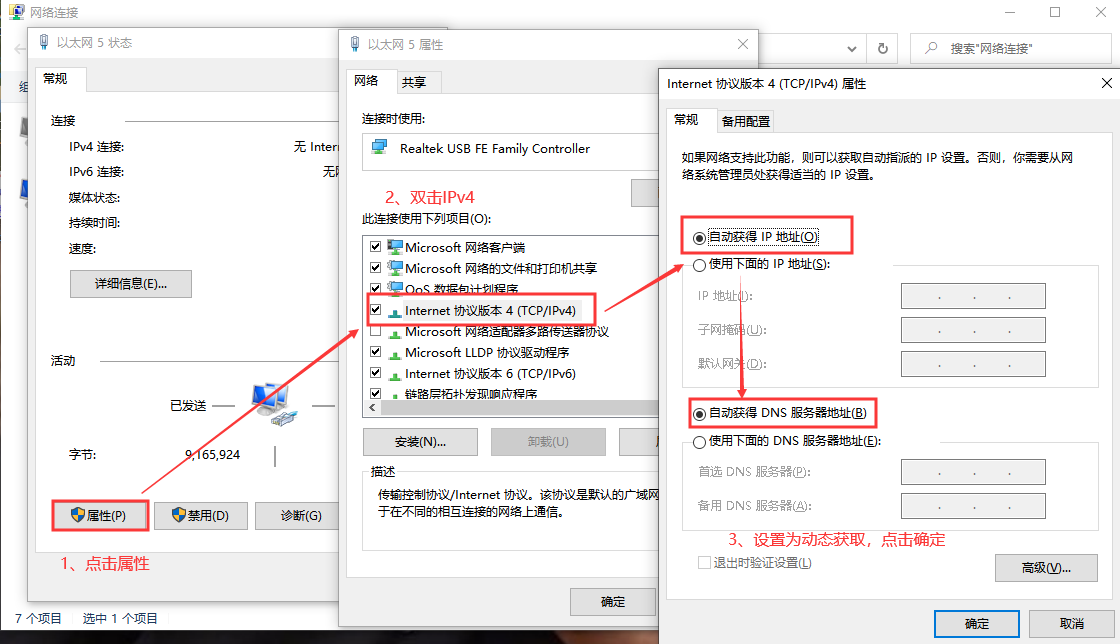 電腦配置網(wǎng)卡,雙擊該網(wǎng)卡選擇屬性,雙擊IPv4進(jìn)入配置界面,勾選動態(tài)獲取之后點擊確定