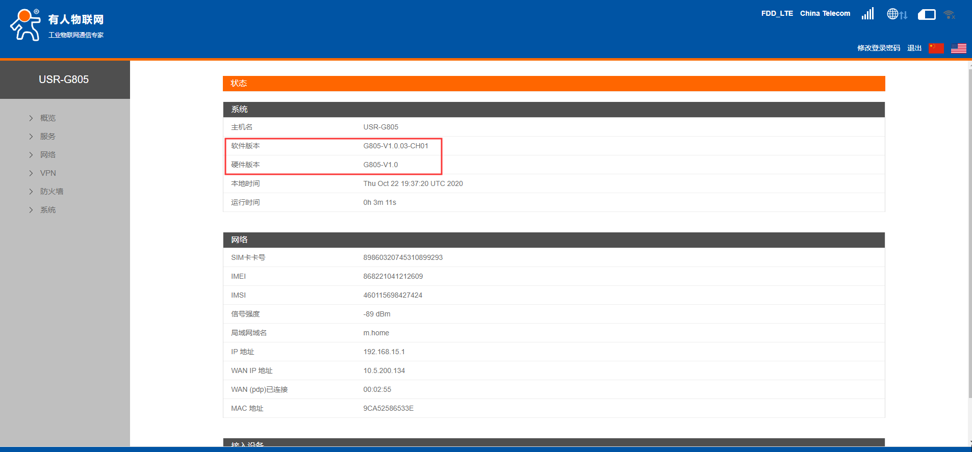 4.在概述--狀態(tài)界面可以看到硬件版本V1.0,軟件版本號為V1.0.03-CH01,現(xiàn)在將模塊固件升級為V1.0.06-release