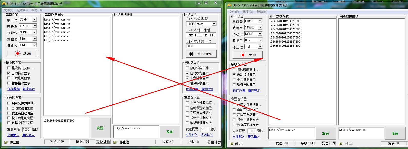 電腦用串口助手打開2個304的COM口,用對應(yīng)304的串口參數(shù),然后進行數(shù)據(jù)傳輸。