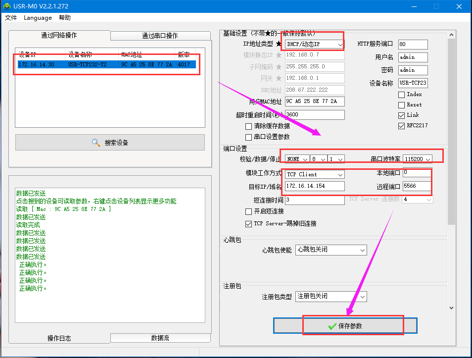 點擊“搜索設(shè)備”,當(dāng)搜索列表中出現(xiàn)T2的設(shè)備后,單擊搜索到的設(shè)備,設(shè)置配置信息并保存(動態(tài)IP)