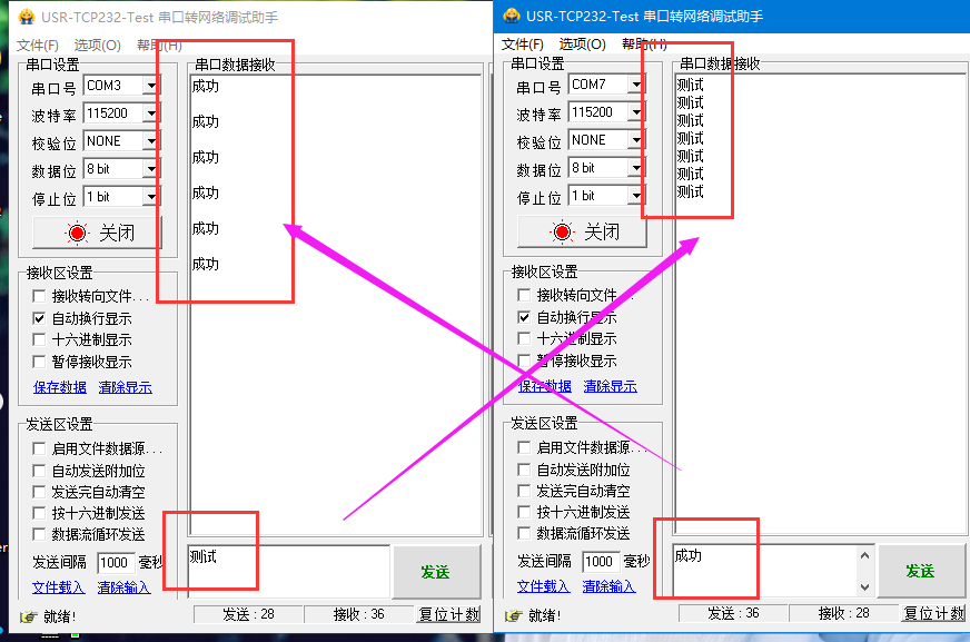 同時打開兩個串口轉(zhuǎn)網(wǎng)絡(luò)助手軟件。一個選擇虛擬串口,一個選擇實際串口COM3,即可進(jìn)行收發(fā)測試