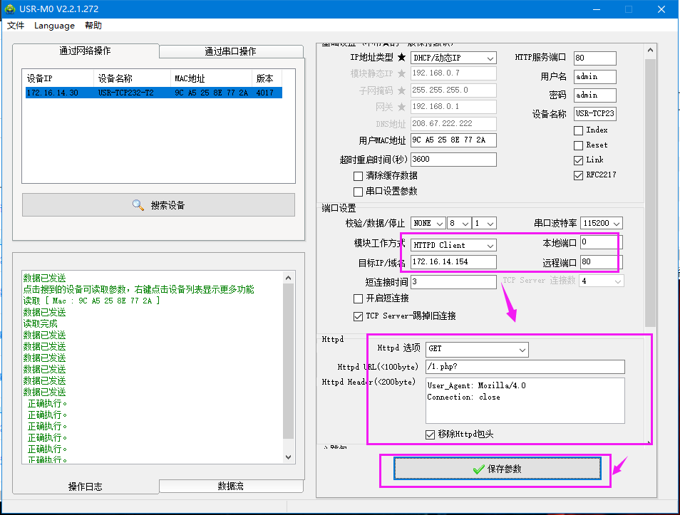 1.設(shè)置軟件設(shè)置,選擇httpd client 模式,局域網(wǎng)HTTP服務(wù)器地址:172.16.14.154 HTTP服務(wù)器端口號(hào)為80,HTTP報(bào)頭路徑為/1.php?,設(shè)置完成點(diǎn)擊保存設(shè)置。